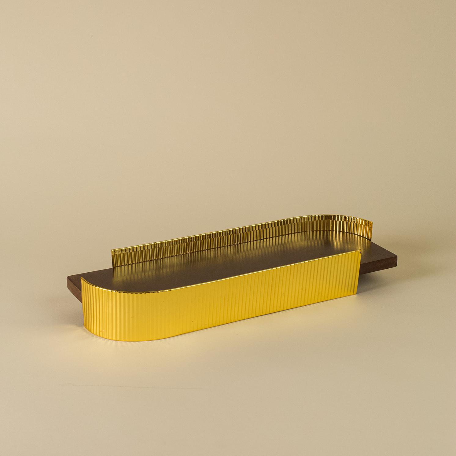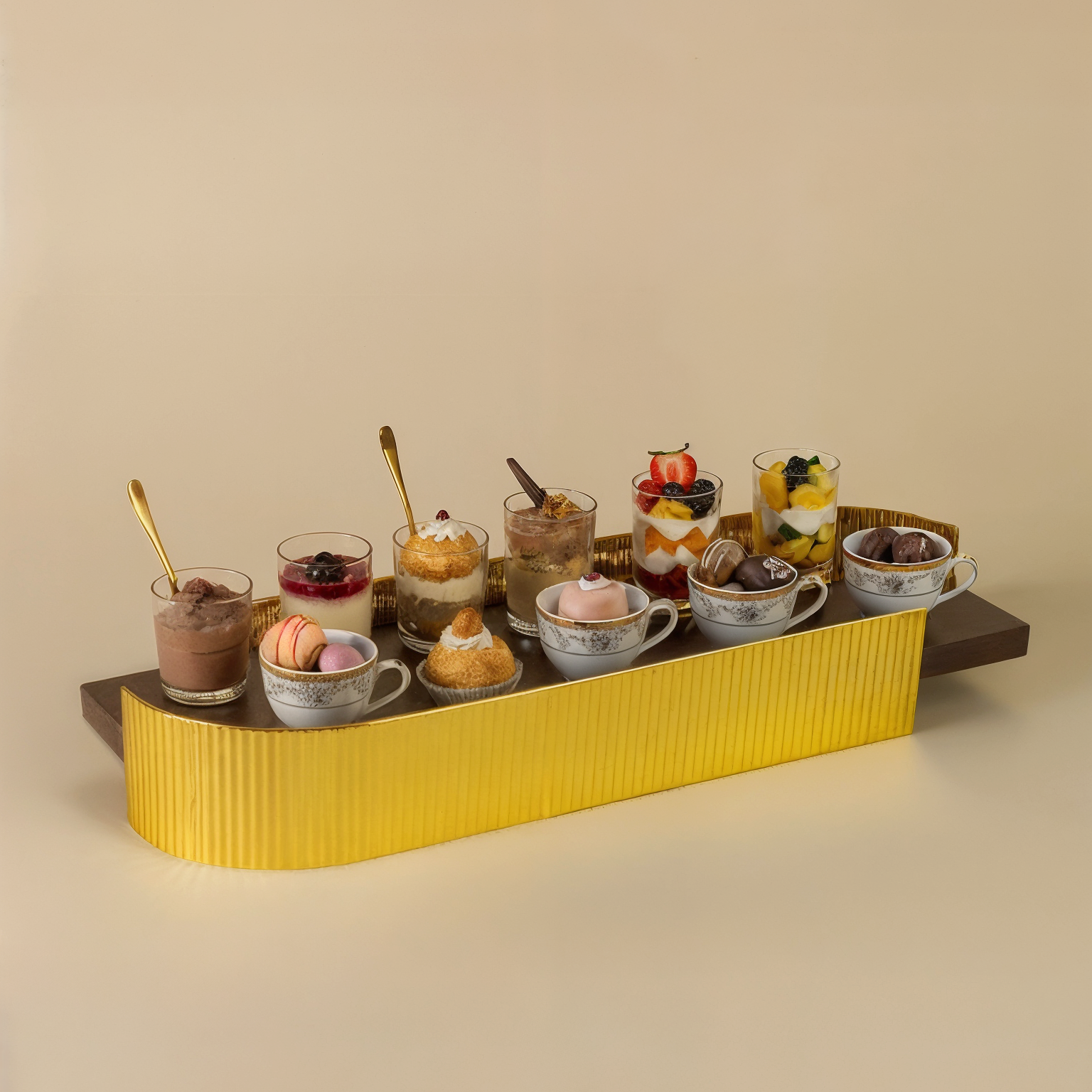 تصميم صحن تقديم من خشب الجوز وبتفاصيل ذهبية مميزة، مناسب للجمعات الصغيرة والتقديم الخفيف.